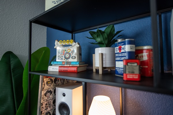 Main living room with Denver-themed mid-century art and furniture