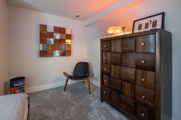 Sleek bedroom and art for bedroom 2 near back of home and facing backyard